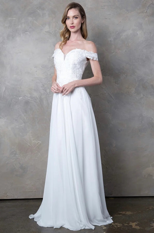 71756 Chiffon skirt. Off shoulder bodice. Applique detail