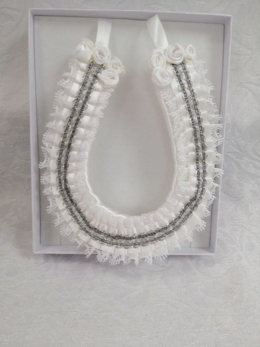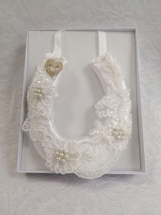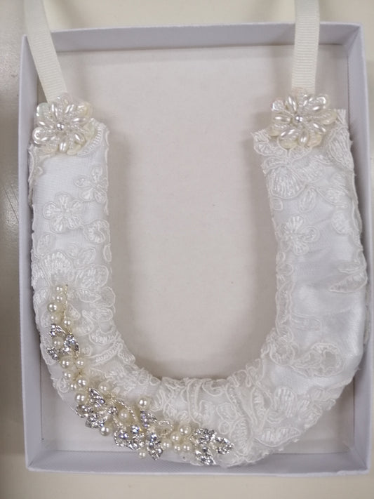 BBHS32 White satin horseshoe with pearls, diamantes and lace embellishments. Hand crafted in NZ
