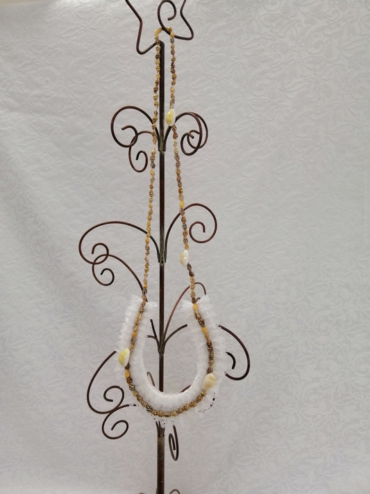 BBHS23 white satin, lace and shell bridal horse shoe. Perfect for a beach wedding.
