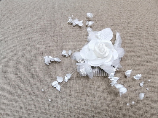BBFAC5 Elegant white fascinator with flowers and petal detail.