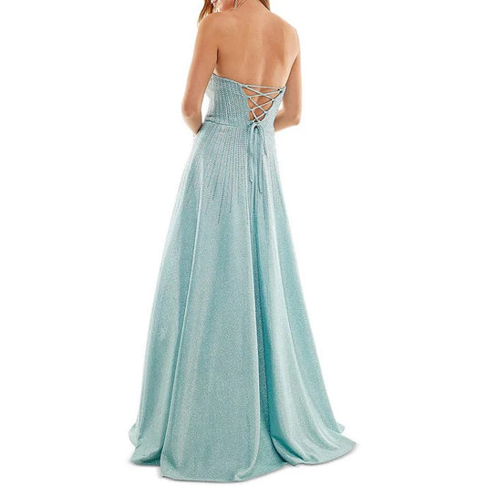 11325B Powder blue Fitted. V neck. Open back. Split. HIRE