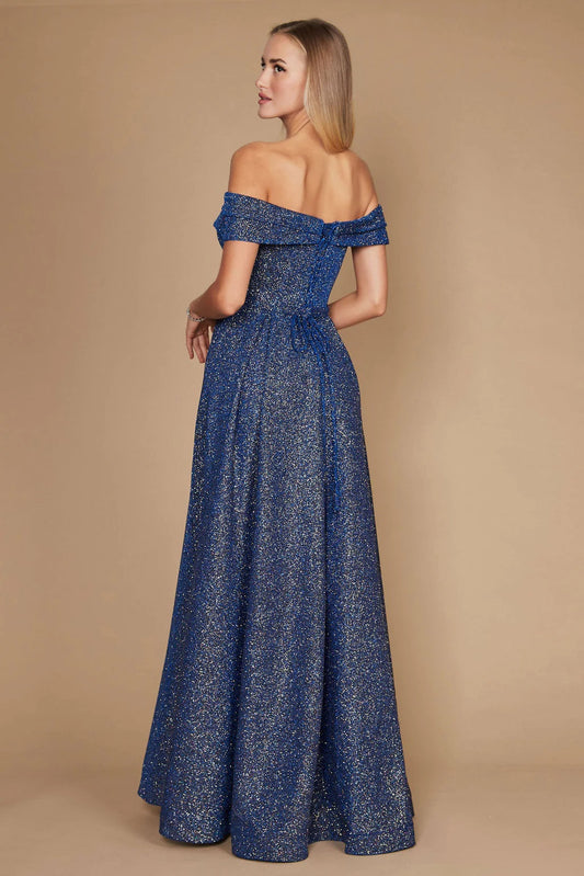 11316 Opal satin off shoulder bodice. A line, floral skirt.