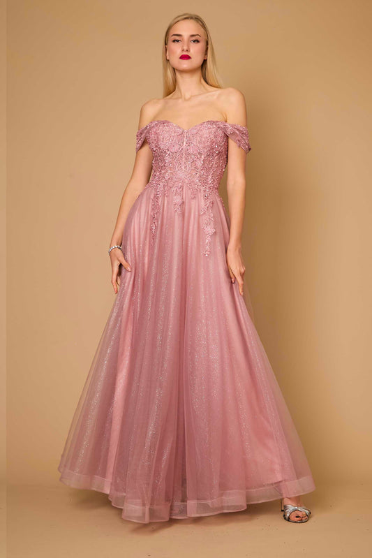11316 Opal satin off shoulder bodice. A line, floral skirt.
