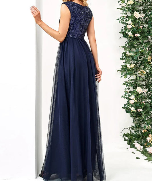 11260. Navy. V neck. A-line tulle skirt. Sequin top. HIRE.