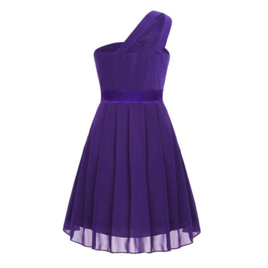 G20237B Sky blue, chiffon, one shoulder. Age 10