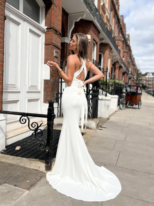 71556 Elegant, cowl neck satin gown with puddle train