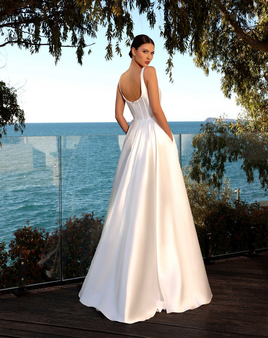 71845 / ARYA. Stunning boat neckline. Mikado satin gown.