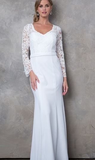 71910 ivory satin/crepe blend. Fitted. Flattering waistline.