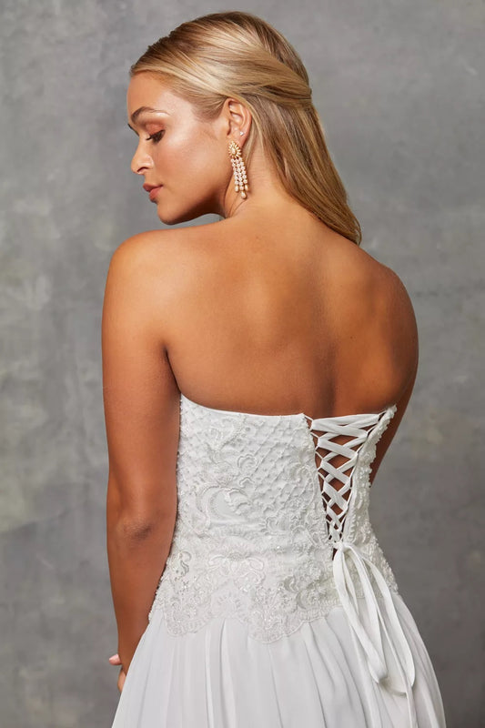 71450 Strapless, corset, beaded bodice. Chiffon skirt.
