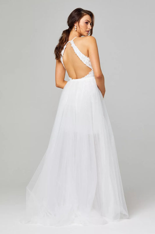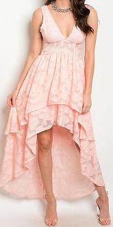 11330- Lace on blush mini with lace fishtail maxi overlay.