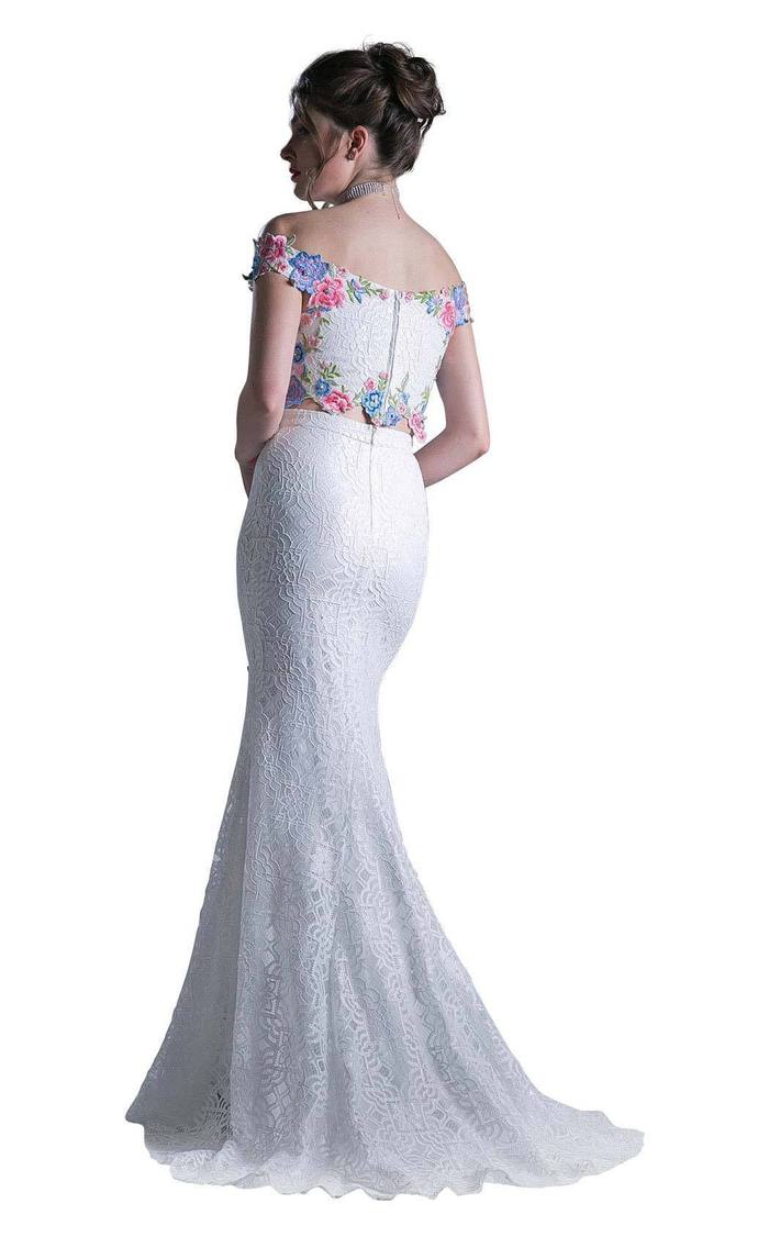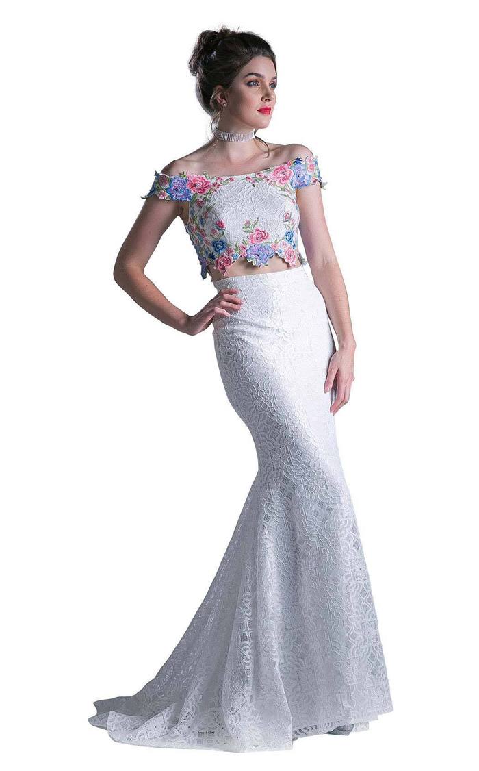 10726 features an off shoulder, white lace crop top trimmed with colourful embroidered roses. A semi fitted white lace skirt with small train. A beautiful option for a garden wedding.