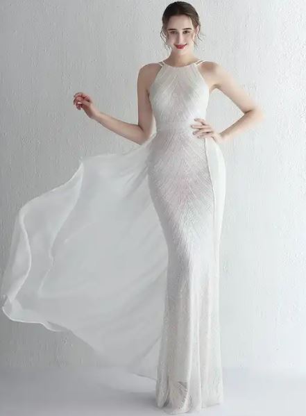 Modern and elegant. Ivory and mother of pearl stretch sequin fit and flare, sleeveless with high neck line