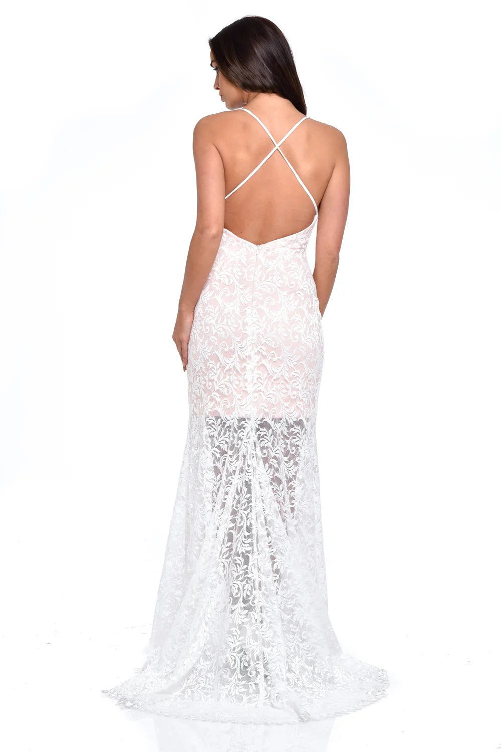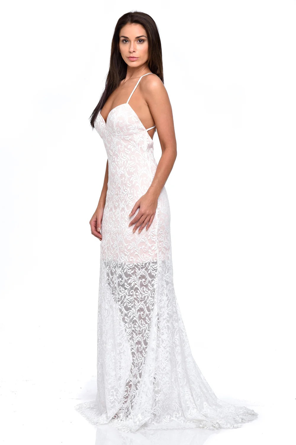 SHEER LACE APPLIQUE FISHTAIL MAXI DRESS