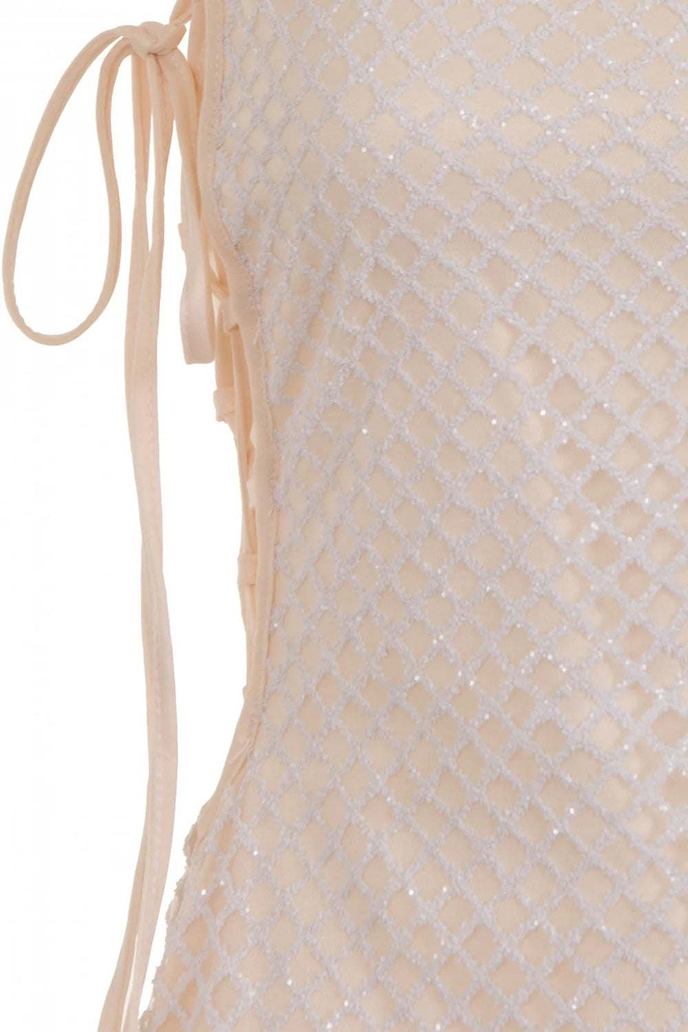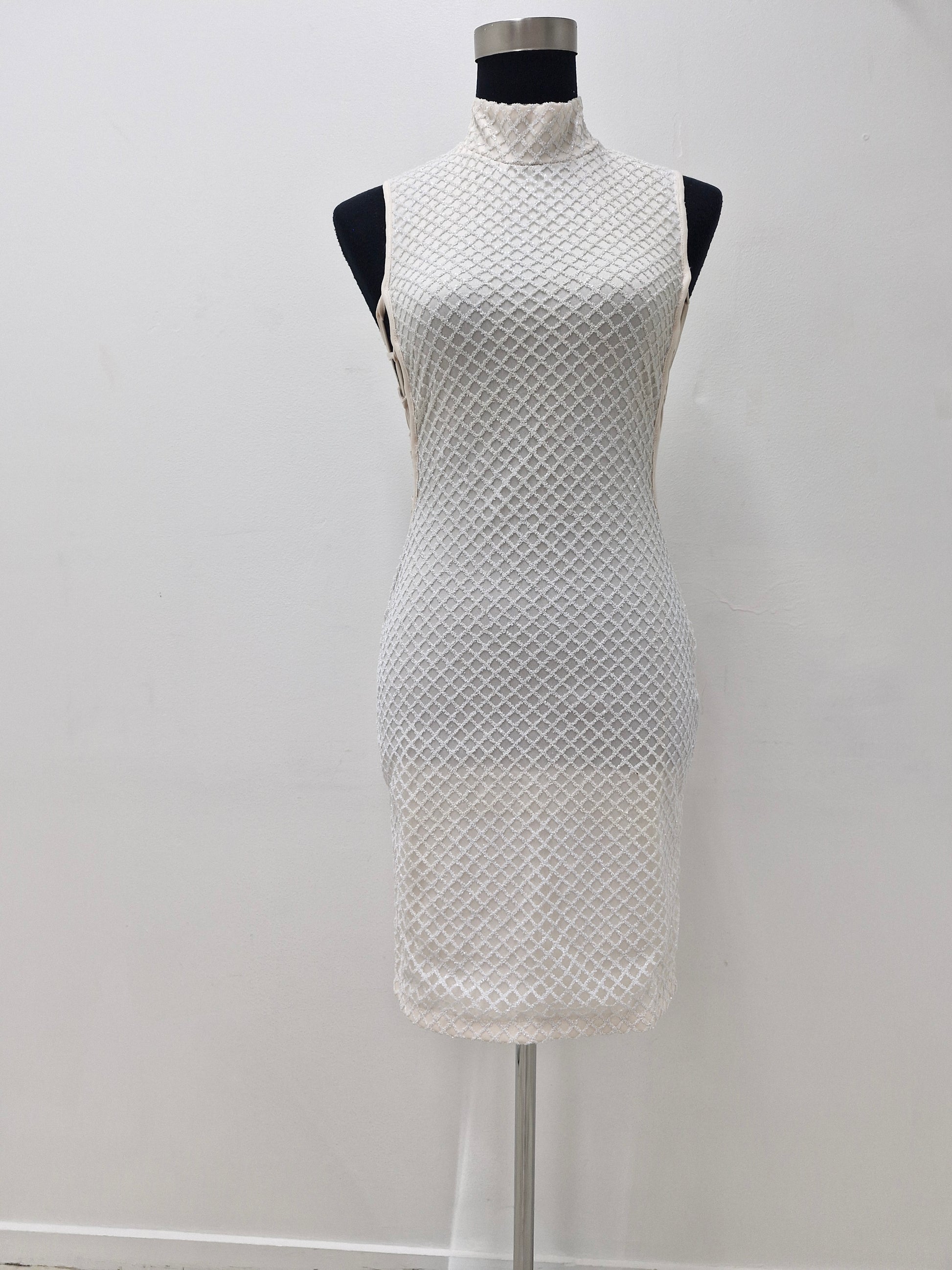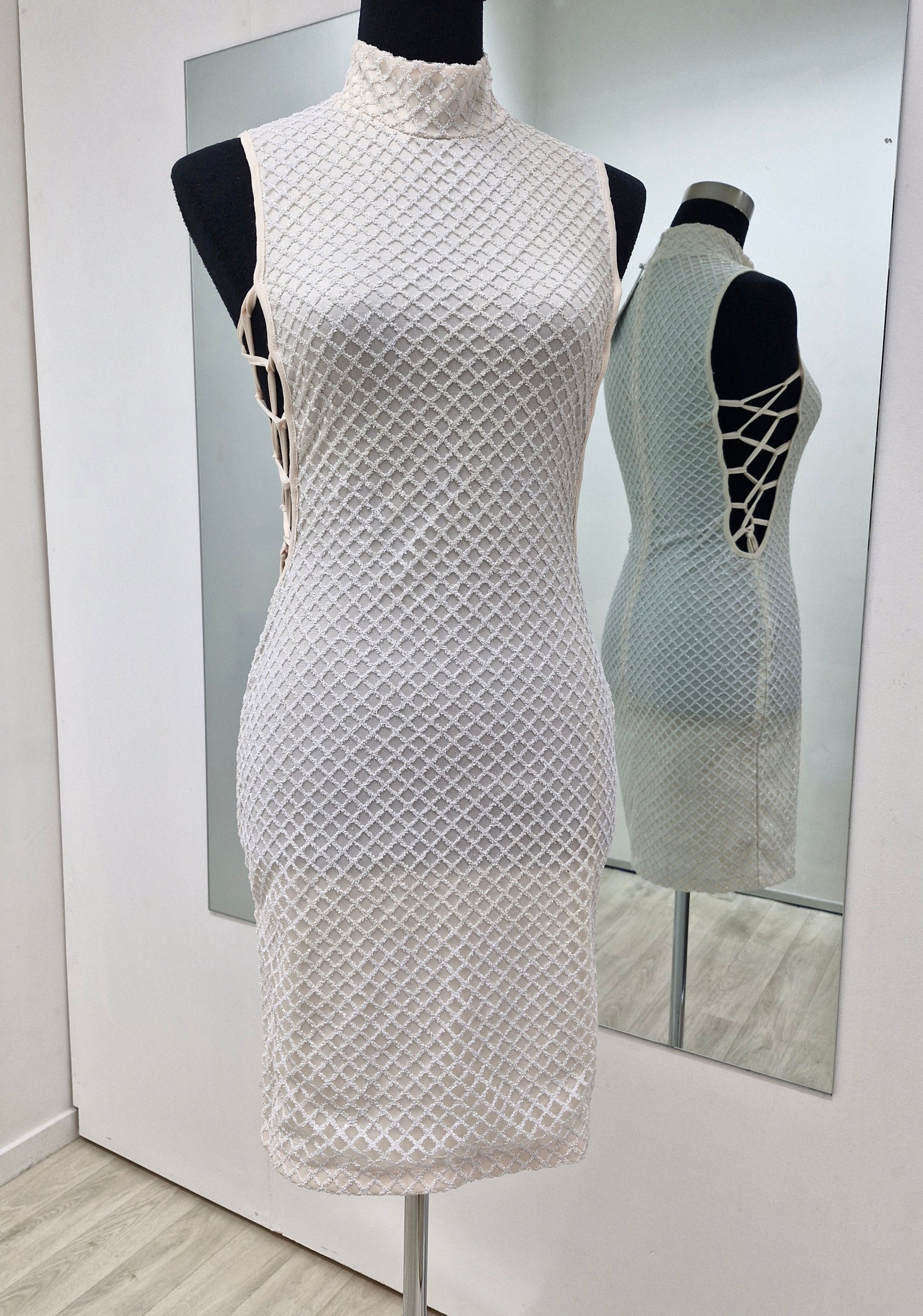 11331- White & Nude High Neck Tie Side Shimmer Sparkle Mini Dress.