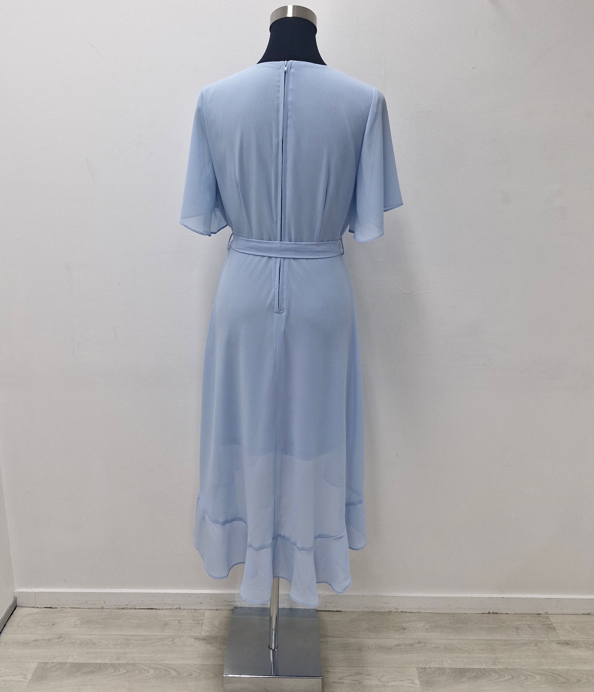11506 Light blue chiffon high low. Short sleeves. HIRE.