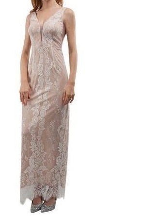 This simple and elegant fit and flare wedding gown is a winner. This modern style with its low V neck and V back with slit is a perfect wedding gown for the informal bride. It has lace detail throughout and the contrast ivory on nude colour will photograph beautifully