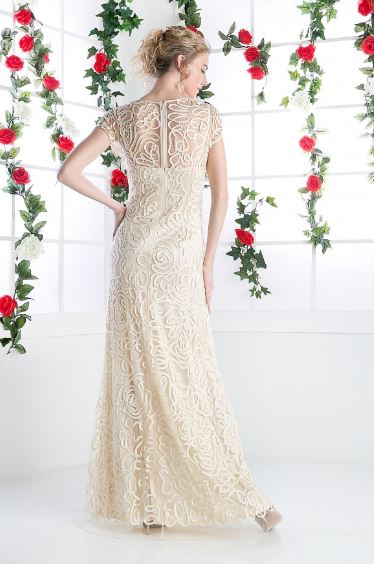 Style 71310 is a simple and elegant gown. The round neck, fit and flare design has a flattering sweetheart neckline lining. It has short capped sleeves. The fabric is a beautiful, textured lace