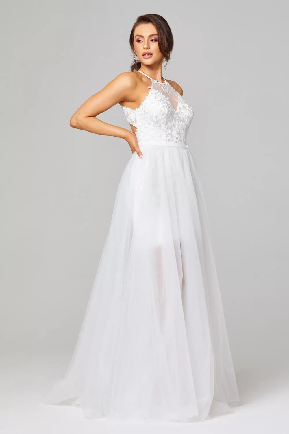 The 71456 wedding dress is an adorable bridal gown that would also be suitable for a reception event. The gown is essentially constructed from a mini dress (longish -just above the knee), which has a full tulle removable skirt flowing from the belted waistband under the bodice.
