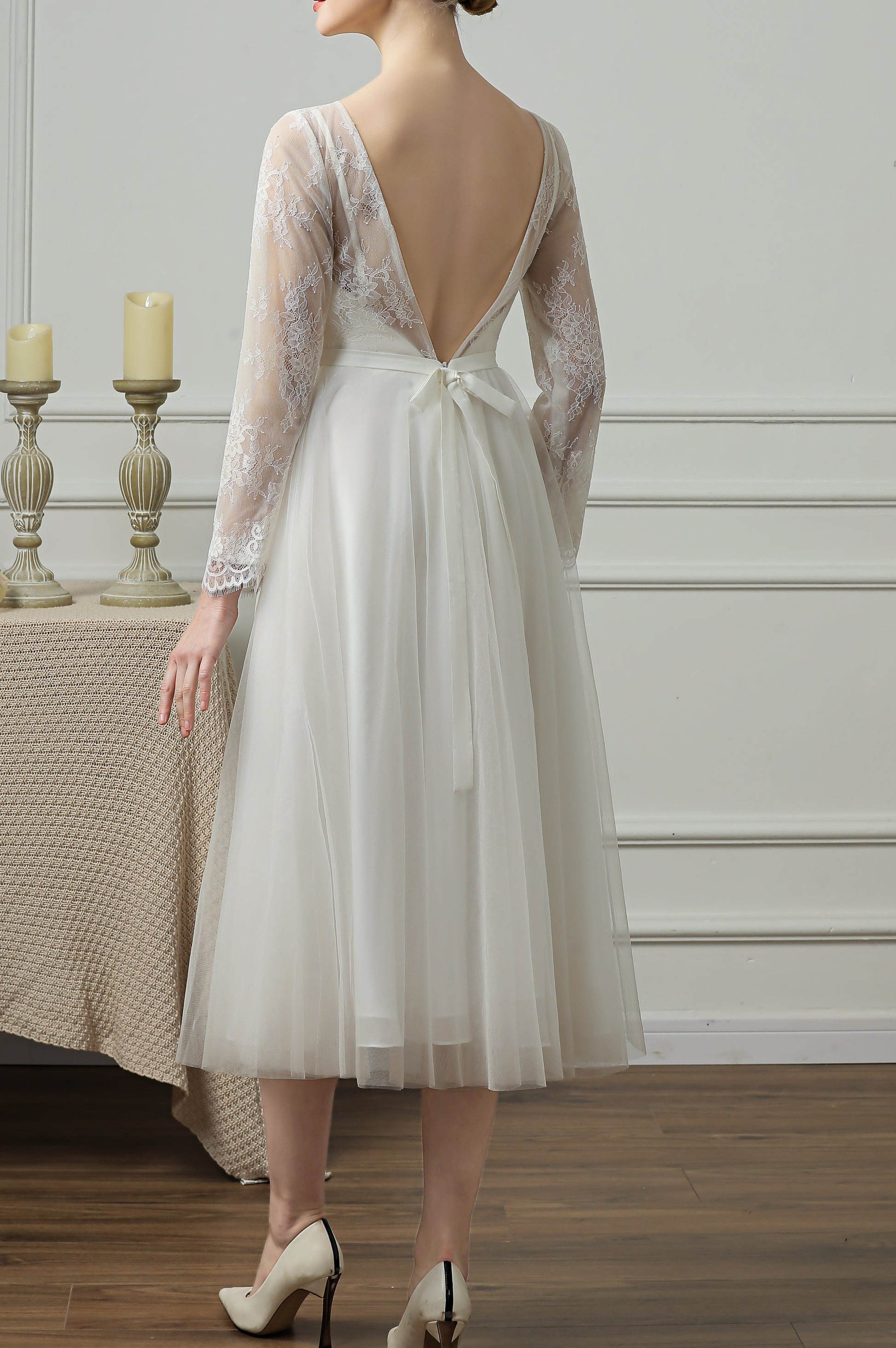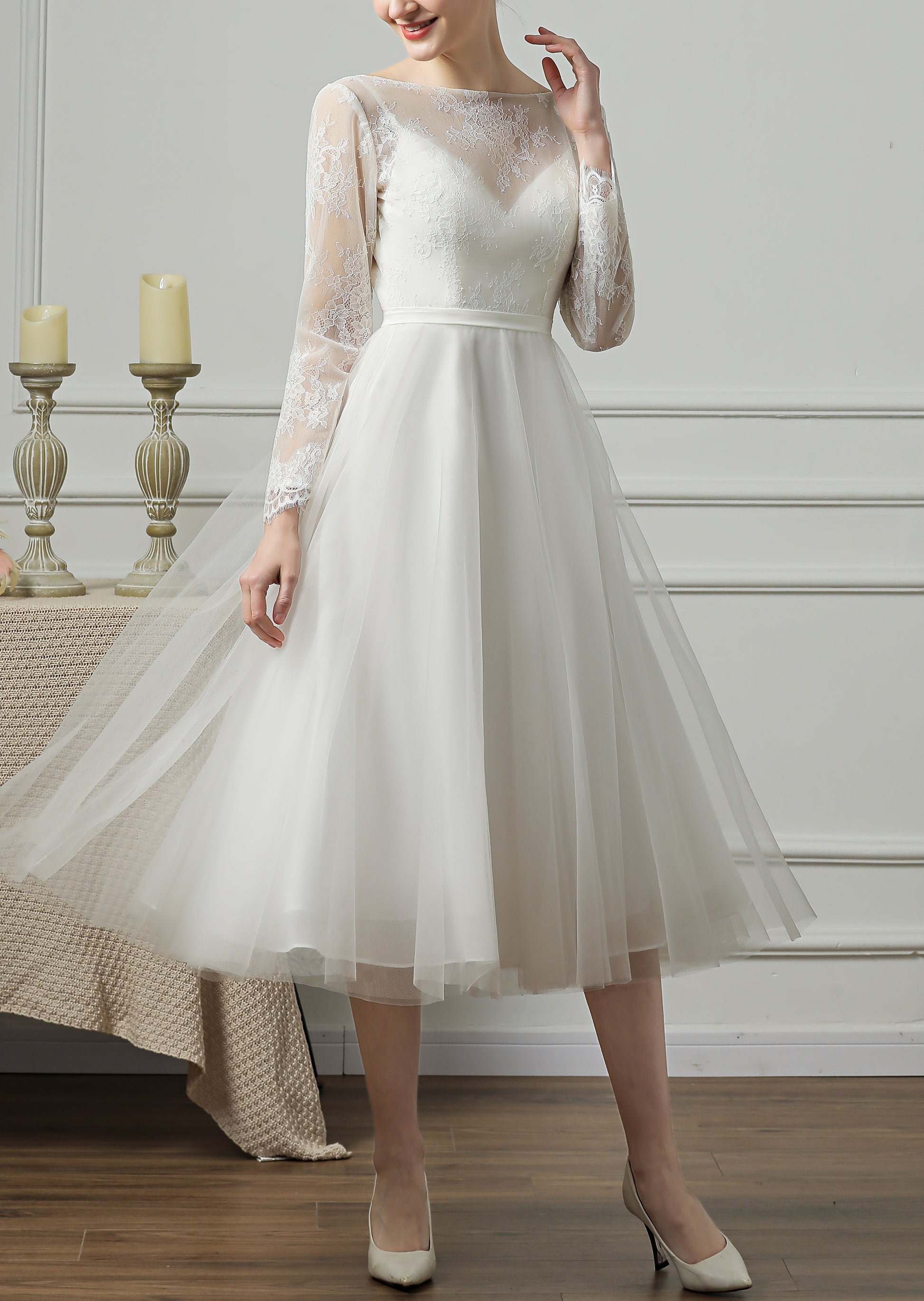 71869- Elegant, long sleeve midi wedding gown