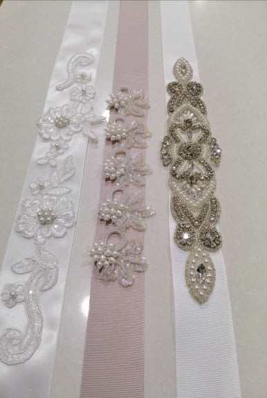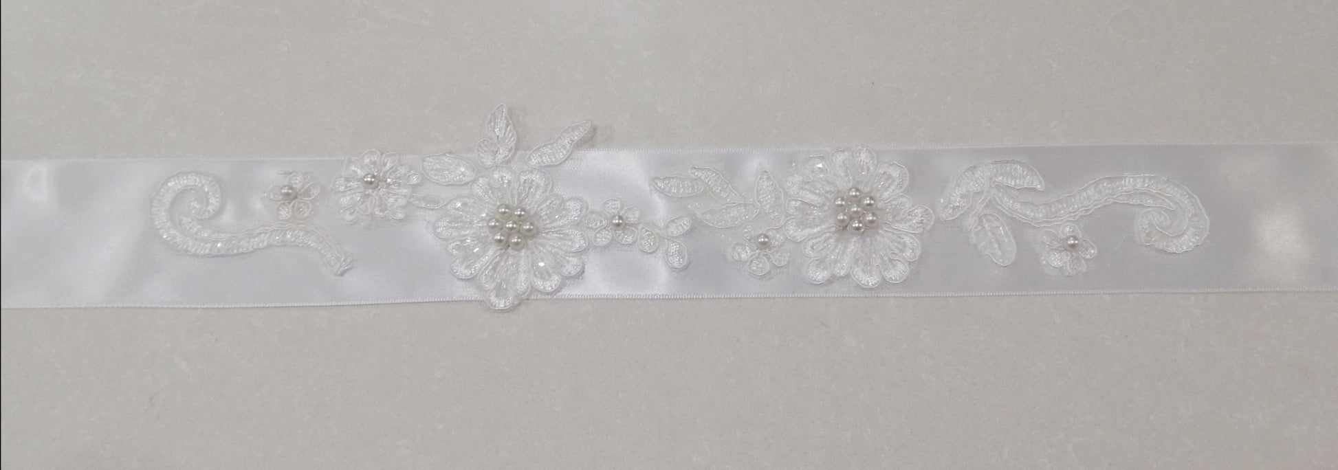 BBB3 Belt made of white satin ribbon with 33cm applique and pearl detail.