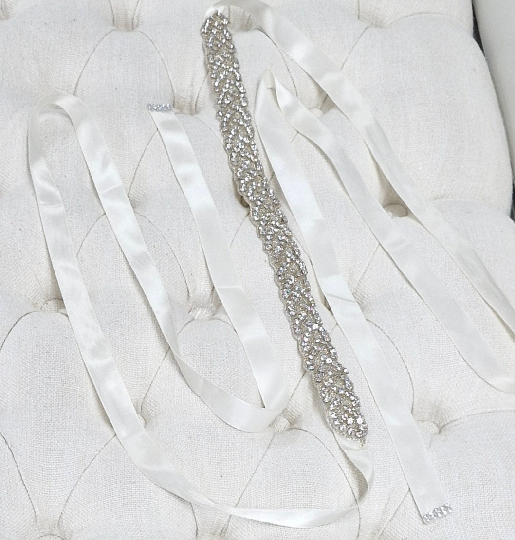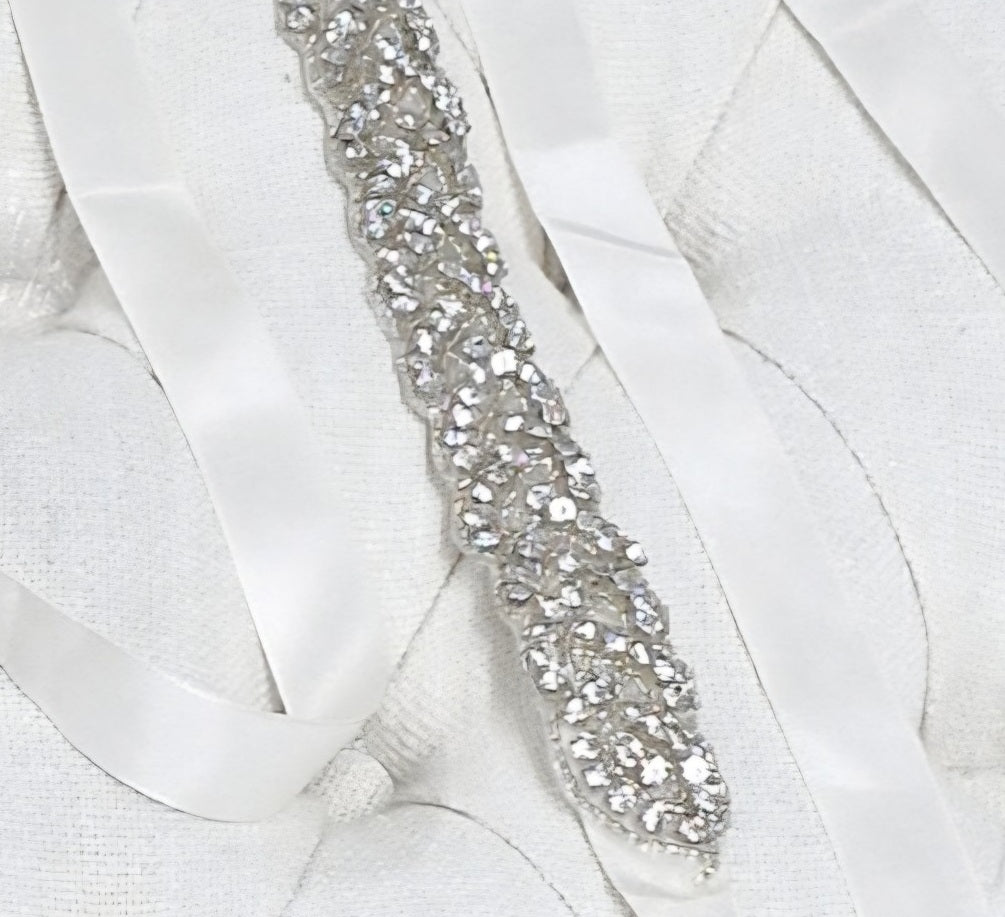 BBB6 Belt made of white satin ribbon with 43cm of diamante detail and ribbon edge diamante trim