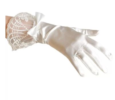 BBGV9. Ivory satin gloves with lace cuff and satin bow.