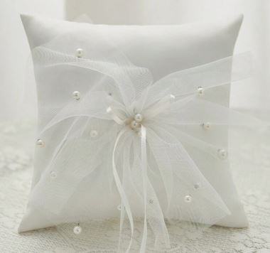 This ring pillow is covered in cream satin. It is decorated with tulle and pearl detail. A thin satin ribbon is used to tie the rings on. Measures 15cm x 15cm