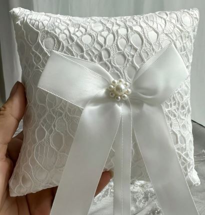 This ring pillow is covered in cream satin and lace. It is decorated with a large satin ribbon iand pearl flower. Measures 15cm x 15cm
