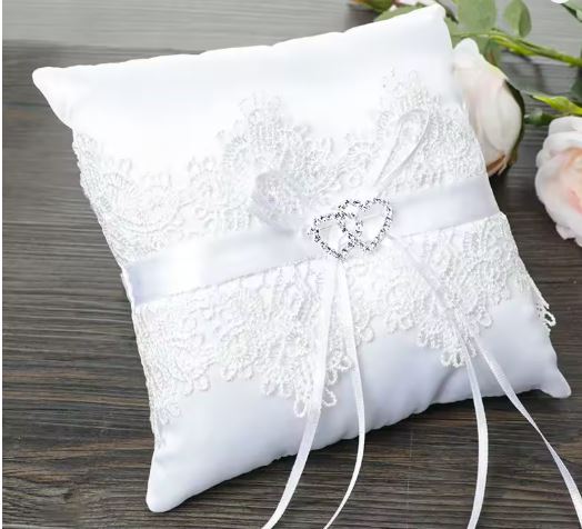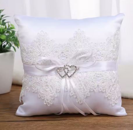 This ring pillow is covered in cream satin. It has a broad textured lace detail and 2 diamante hearts. Measures 15cm x 15cm